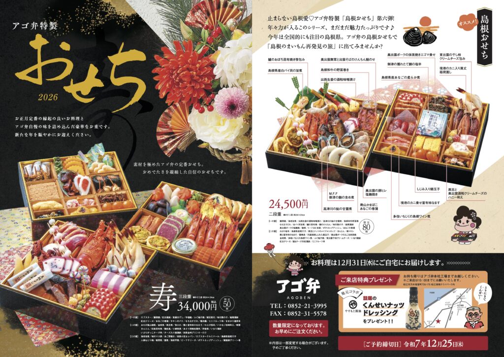 お知らせ 2025.11.12 おせち料理のご案内 今年もおせち料理のお知らせをさせていただく季節となりました。 「島根おせち」に「洋風おせち」などなど、今年も工夫を凝らした内容となっております! 数量限定販売となっておりますので、ご注文はお早めに♪ 社員一同、皆様からのご注文を心よりお待ちしております。