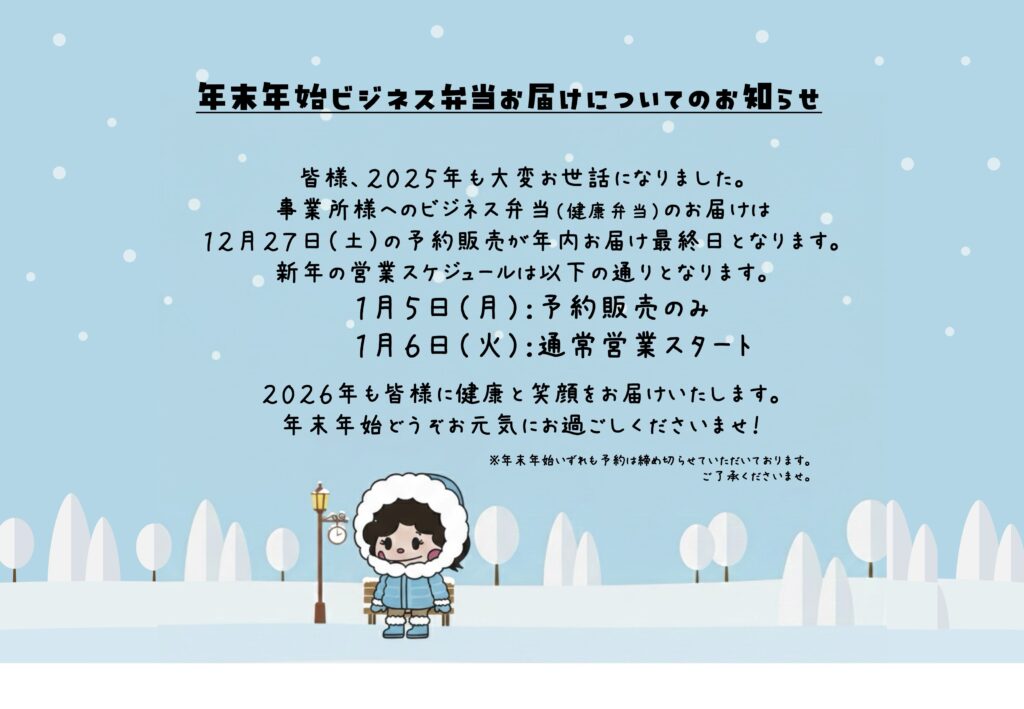 お知らせ 2025.12.26 年末年始のお知らせ 皆様、2025年も大変お世話になりました。 事業所様へのビジネス弁当(健康弁当)のお届けは 12月27日(土)の予約販売が年内お届け最終日となります。 新年の営業スケジュールは以下の通りとなります。 1月5日(月):予約販売のみ 1月6日(火):通常営業スタート 2026年も皆様に健康と笑顔をお届けいたします。 年末年始どうぞお元気にお過ごしくださいませ! ※年末年始いずれも予約は締め切らせていただいております。ご了承くださいませ。
